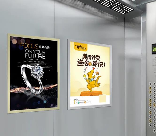 電梯框架廣告是指電梯轎廂內的廣告框,一般用來安裝廣告海報,起到廣告作用。電梯廣告框架是生活中最常見的電梯廣告類型,也最為普遍的類型,通常在商場、小區(qū)電梯內是常常可以看見的一種廣告方式。在投放此類廣告商一定要在海報設計上富有創(chuàng)意,采用多圖少字的設計,信息量充足,這樣才能達到傳播的效果。