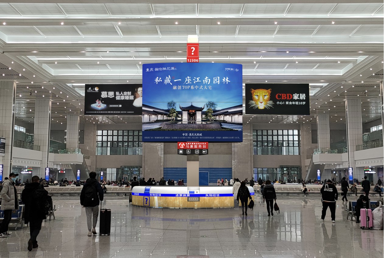 | 北站出發(fā)-候車廳綜合服務(wù)島翼展屏(D65) 媒體區(qū)域:重慶北站候車廳 媒體數(shù)量:1個 媒體尺寸:6.4mX5.12mX2面 媒體材質(zhì):360度旋轉(zhuǎn)LED屏 亮屏?xí)r間:05:00-22:30(17.5H) 候車廳中軸線上,媒體高大,視線焦點 候車廳服務(wù)臺中心媒體,乘客注意中心,100%覆蓋重慶北站出發(fā)人群 創(chuàng)新旋轉(zhuǎn)屏,是廣告,更是風(fēng)景線 |