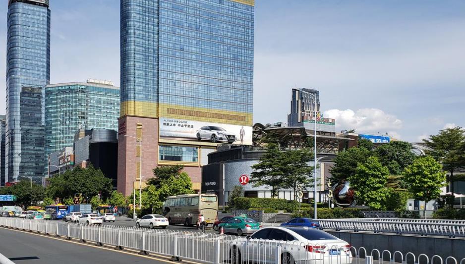 正佳廣場西門,正佳廣場主入口之一,BRT與地鐵線交匯于此,路段人車流巨大。