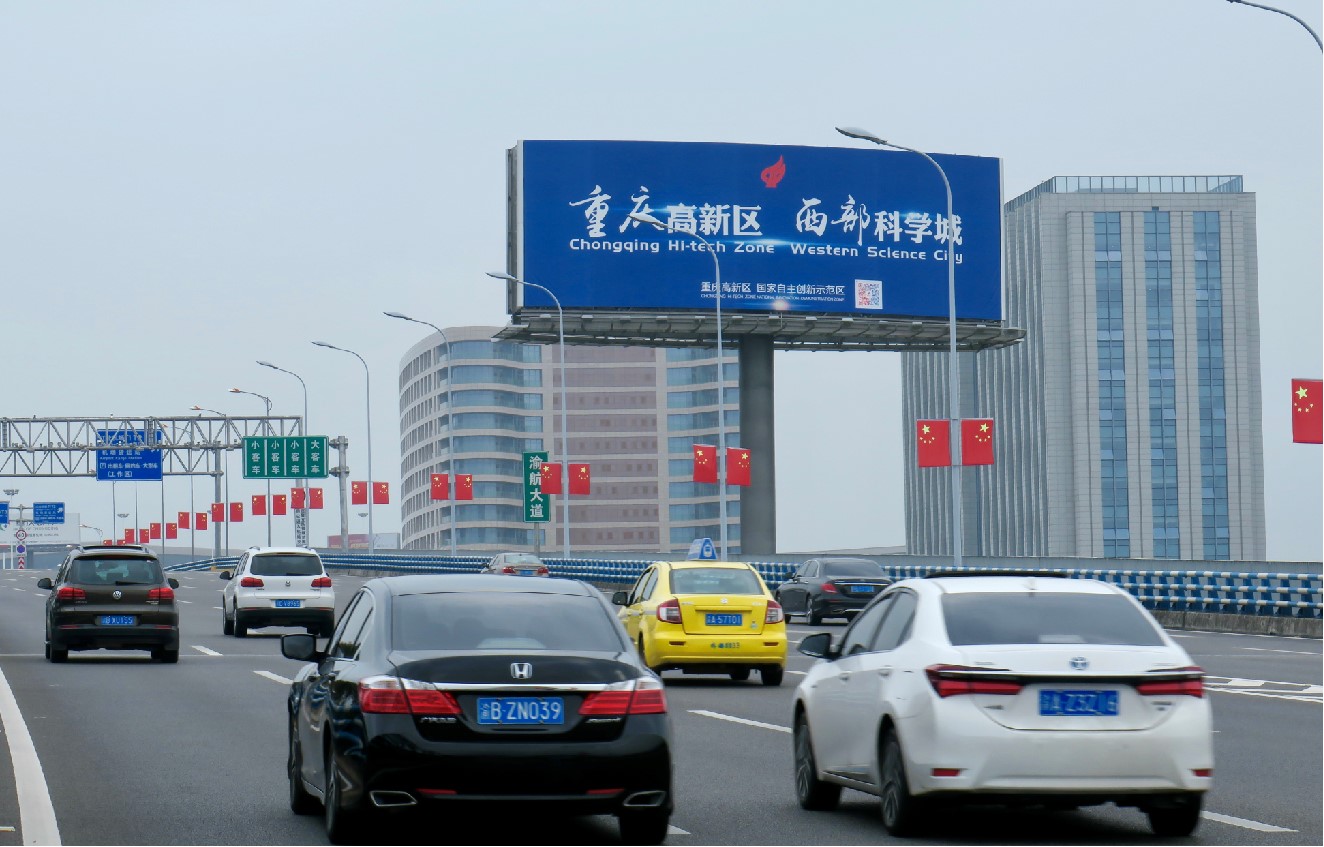 媒體位于立交西上道口同時能有效輻射立交西出口的所有車輛,距離重慶機場7公里路程,主要承擔江北,渝北到T3機場以及出城東向的車流,進出群體多元,車流量大,輻射范圍廣。該區域無競爭媒體,廣告發布形式單一,視覺沖擊力強,有利于廣告信息的傳播,是企業提高知名度的理想媒體
